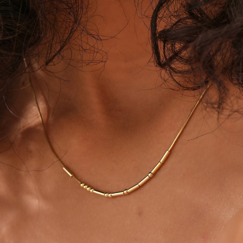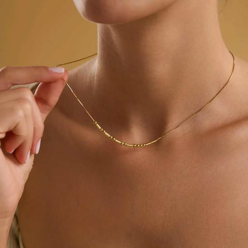 Born from the language of dots and dashes, the Morse Code Necklace transforms communication into something timeless and intimate. Once used to bridge vast distances, Morse code now becomes a way to carry words closest to your heart, a secret between you and the wearer, hidden in plain sight.